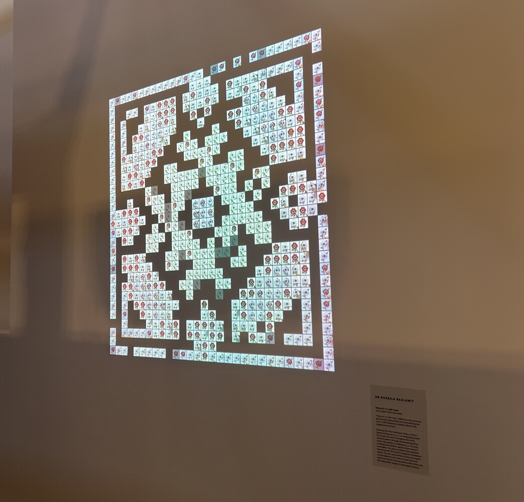 This work reflects on the profound grief and the impossibility of memorialising the over 17,400 Palestinian children killed in the ongoing war on Gaza. Drawing from the traditional Gazan embroidery motif Qamar el-Damoua’ (قمر الدموع), or “Moon of Tears,” the work reimagines this cross-stitched pattern through the blooming of native red poppies (Anemone coronaria), known in Palestinian folklore as Al-Dahnoon (الدحنون). It is believed these flowers sprout where martyrs have fallen.
