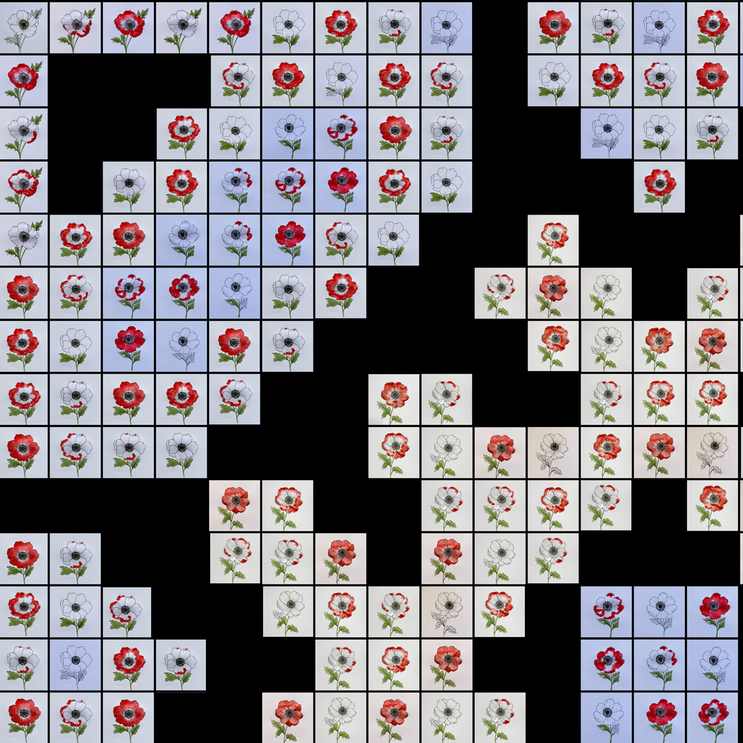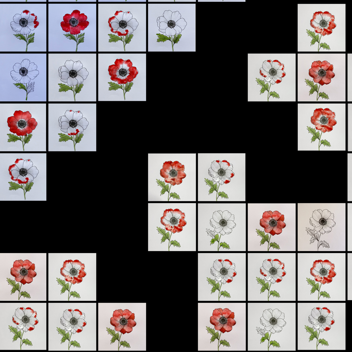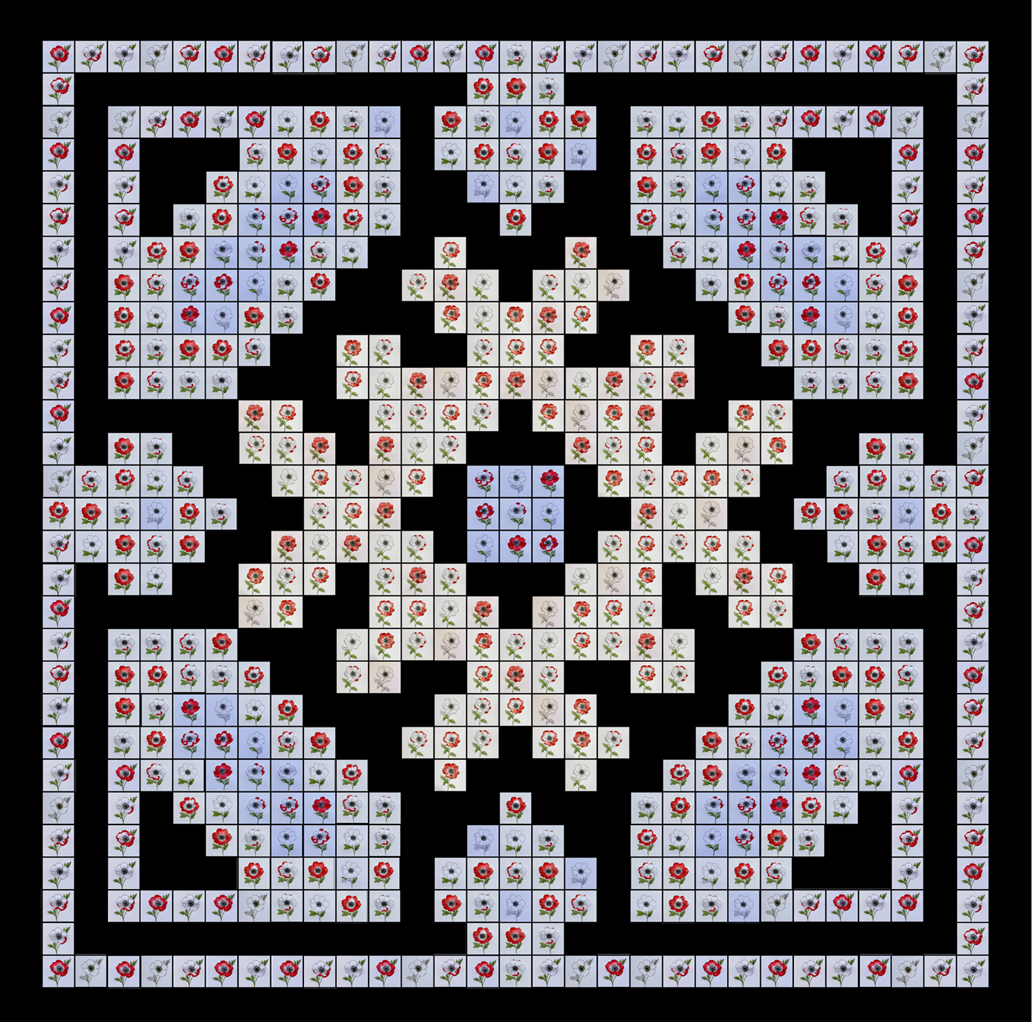 To create the video installation, I filmed myself watercolouring 574 individual poppies. Each of these video clips was placed according to the geometry of the original embroidery pattern. The composition loops continuously, with the videos fading in and out as each flower is completed—emerging and disappearing like fleeting lives remembered in ritual.